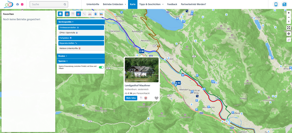 Unterkünfte, Verleiher, Gastronomiebetriebe oder Tourenanbieter erscheinen direkt auf der Karte und in den Etappen.